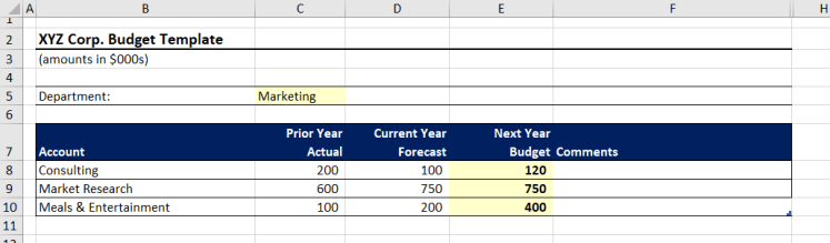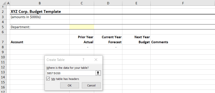 This will be the template that departments use to input their budgets. In the simple example below, we’re capturing the account, prior and current year amounts, and next year’s budget request, along with a column for comments.