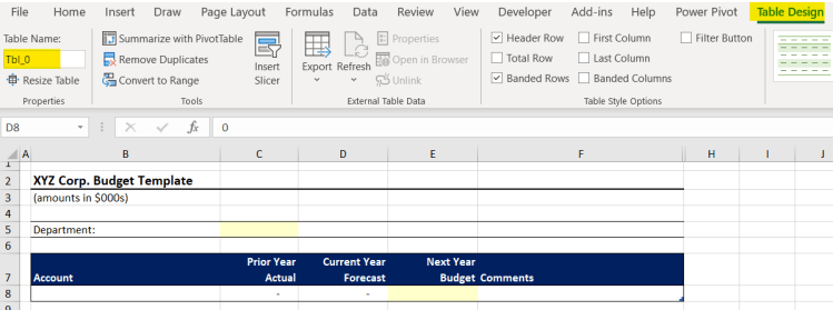 With any cell selected within the table, click on Table Design and note there is a box to key in a Table Name, as shown below. Name the table Tbl_0. As you’ll see later on, this naming is a key step to automating the data consolidation.