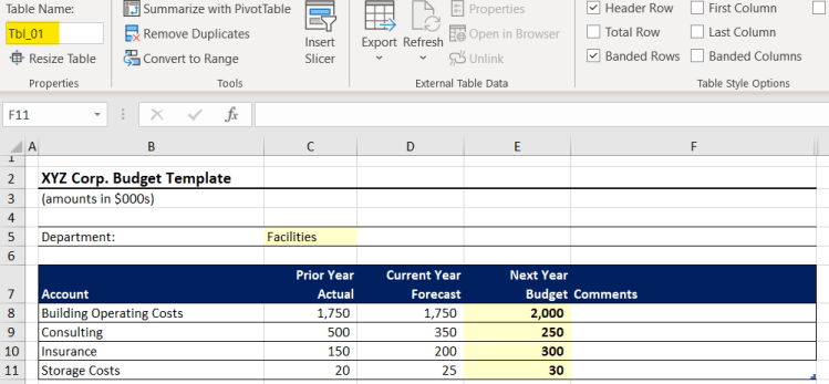 With the blank template now setup, make a copy of the worksheet and fill it in for a department (i.e., so that in this one file you will have multiple tabs – one per department). The example below shows a fictitious Facilities department budget. Note that when copying the worksheet, Excel automatically renamed the table for us. It keeps the “Tbl_” prefix from the template and increments it; again, you’ll see soon why this is important for automating the roll up (note that the actual number Excel gives it doesn’t matter; just the prefix needs to match).