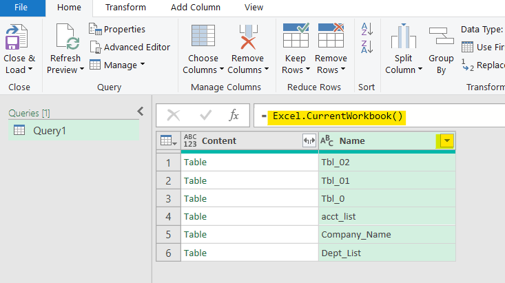 In the screen that appears next, type = Excel.CurrentWorkbook() in the formula bar and hit the Enter or the checkmark icon. This tells Power Query to connect to your Excel file itself, rather than an external data source: