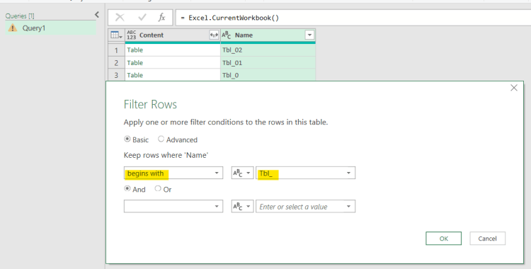 This brings up a window listing all the content with the workbook. From here we will filter the list so that we only connect to tables beginning with “Tbl_” (i.e., our data entry sheets). To do this, hit the filter arrow in the Name column heading, and then key in the filter details as below and hit OK: