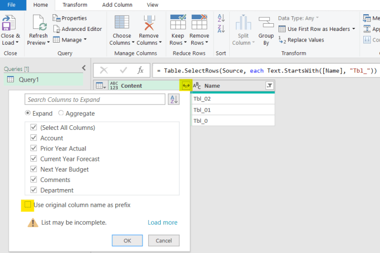 Next, we need to tell Power Query which columns we want to pull from these tables. This is done by hitting the “Expand” arrows in the Content column header. As shown below, you can pick and choose which columns you’d like to include (in this example we’ve selected all); just be sure to uncheck the “use original column name as prefix” box. Keeping it unchecked allows Power Query to append (i.e., combine) all the individual data entry tables.