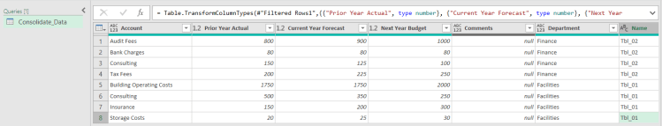 After hitting OK you’ll be presented with a preview of the combined table, including all rows from the Facilities and Finance budget tables. To clean it up a bit, we’ve filtered the Account field to exclude the table named Tbl_0 (the original blank template). There is no harm in keeping it included, but it will result in a blank row that’s unnecessary at the bottom of the table.