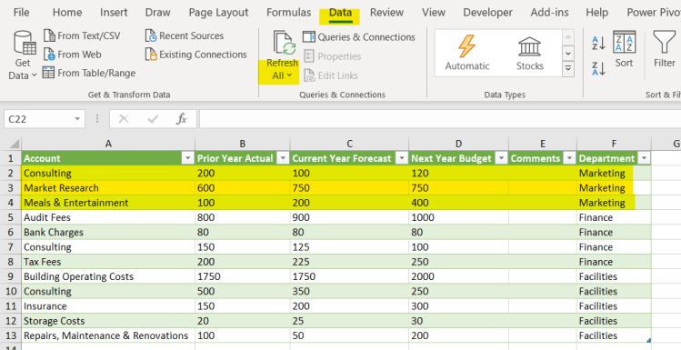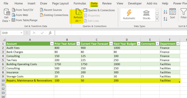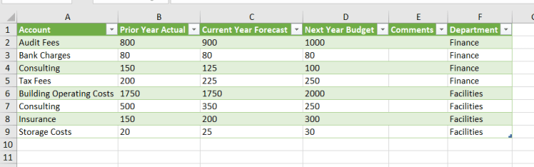 For example, imagine the Facilities department missed budgeting for repairs and maintenance. If you input a budget for that account on their sheet and then refresh the consolidated table, it will flow in automatically: