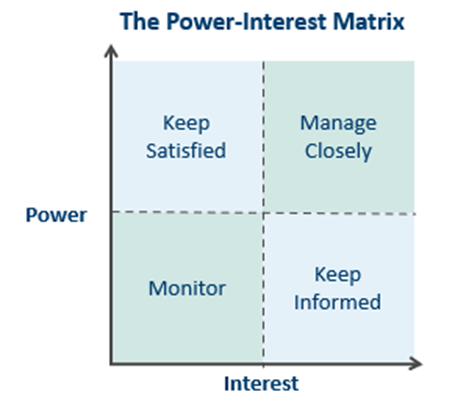 Below is a diagram of an assessment tool you can use to identify and document your stakeholders and their level of power and interest.